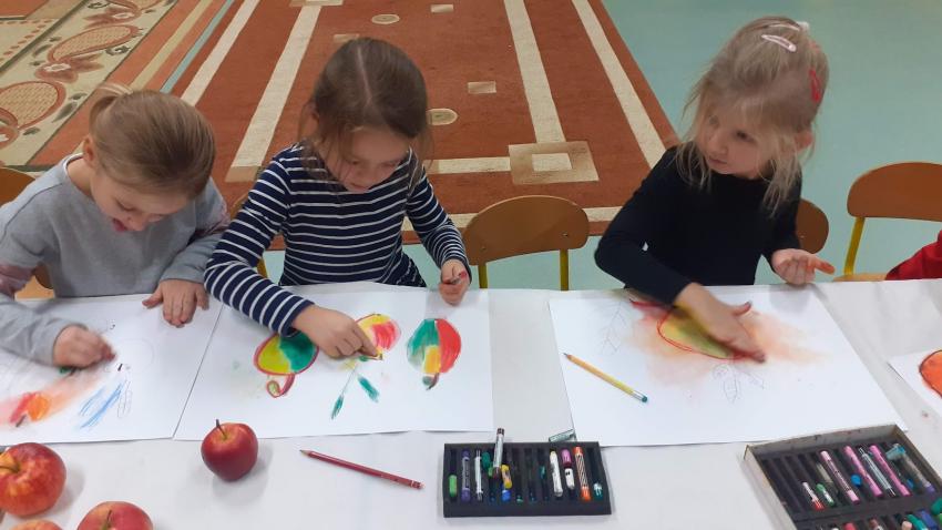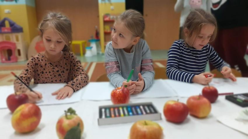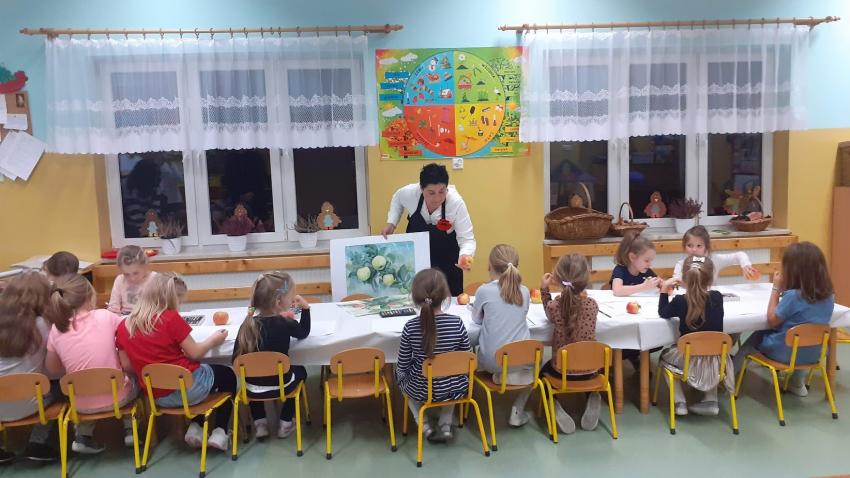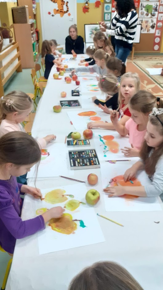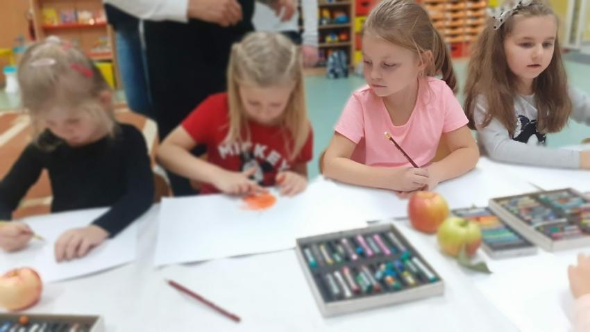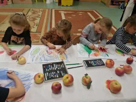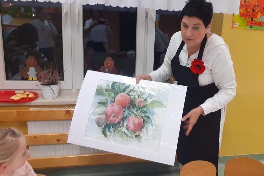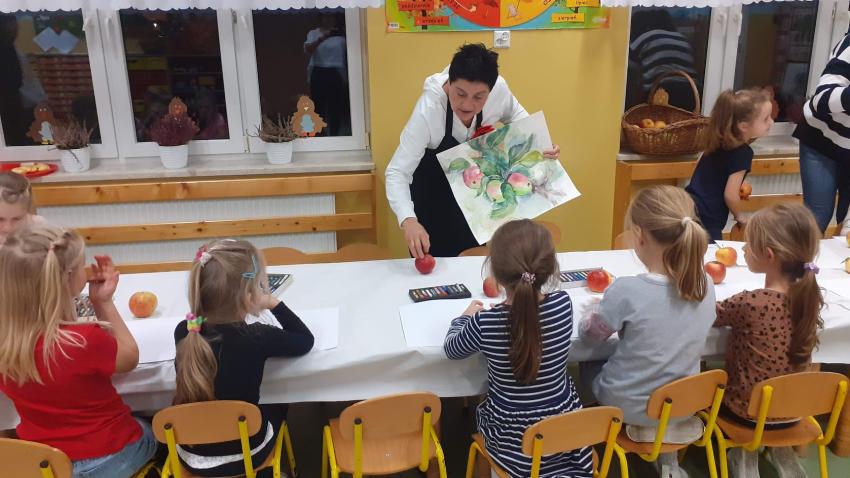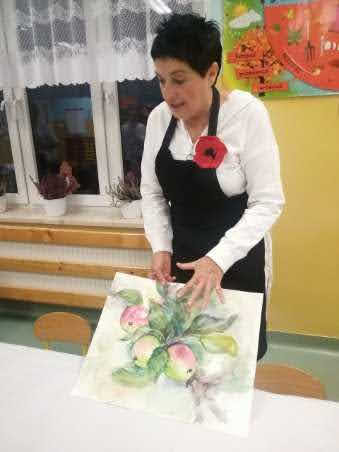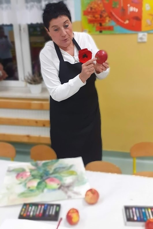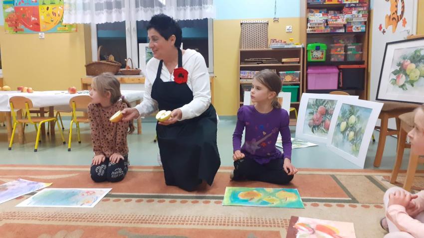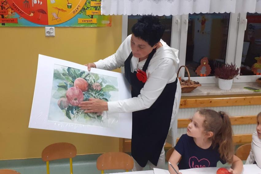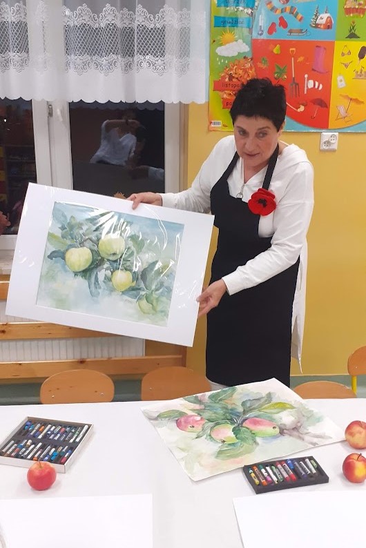 "Jabłka" - warsztaty plastyczne z artystką, malarką Panią Teresą Pietras. Kółko plastyczne.