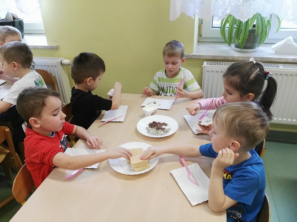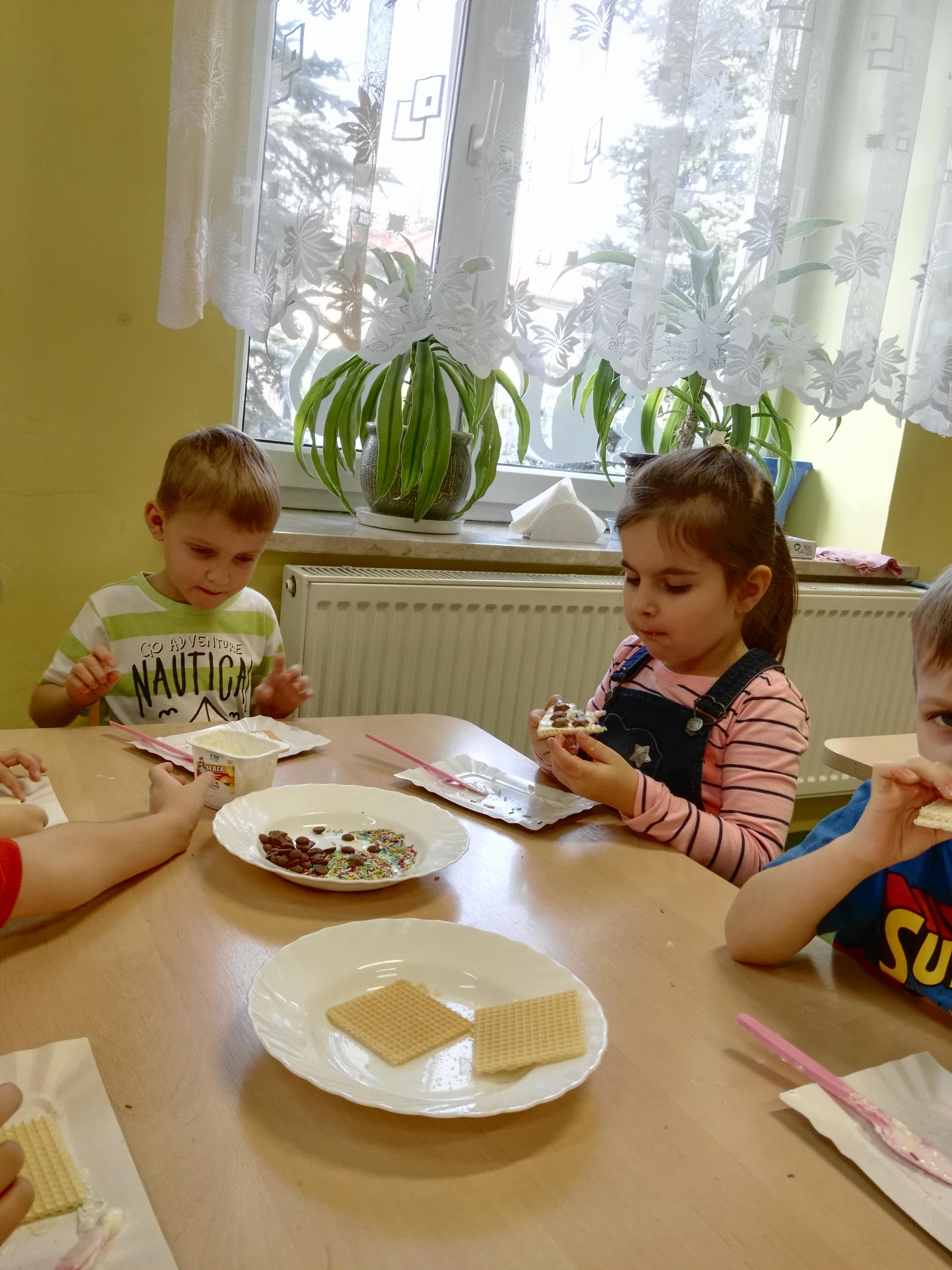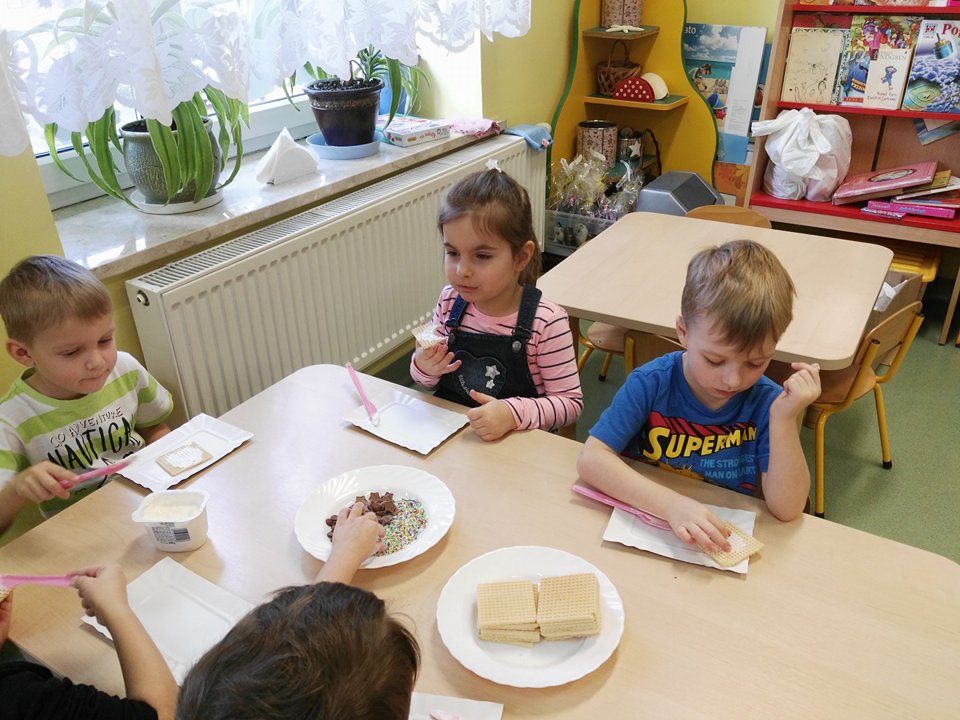 Dzieci z grupy "Kotki" wiedzą jak miło i przyjemnie przetrwac mroźne dni. W ramach zajęć kulinarnych zabrarały się za przygotwanie słodkiej kanapki.